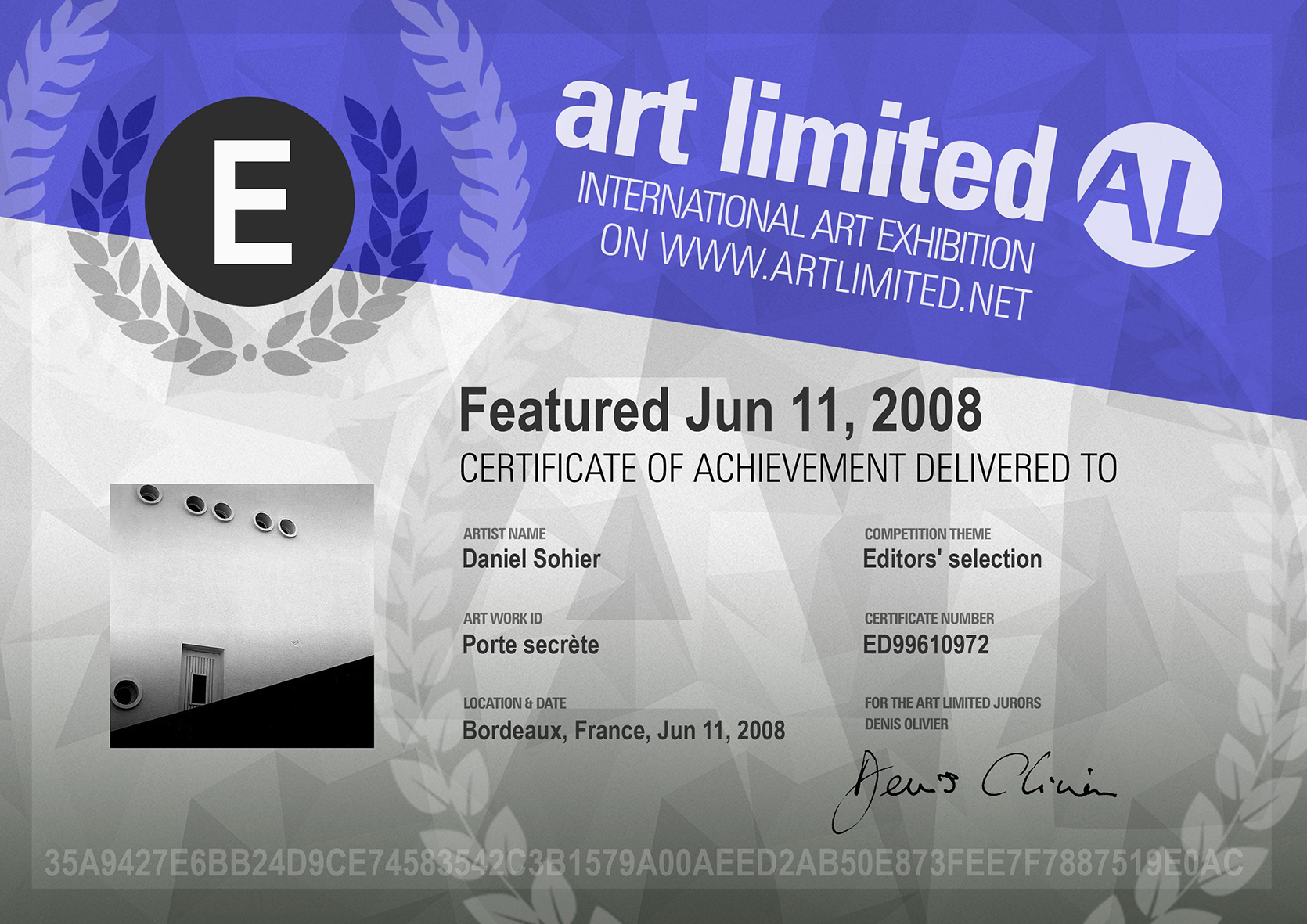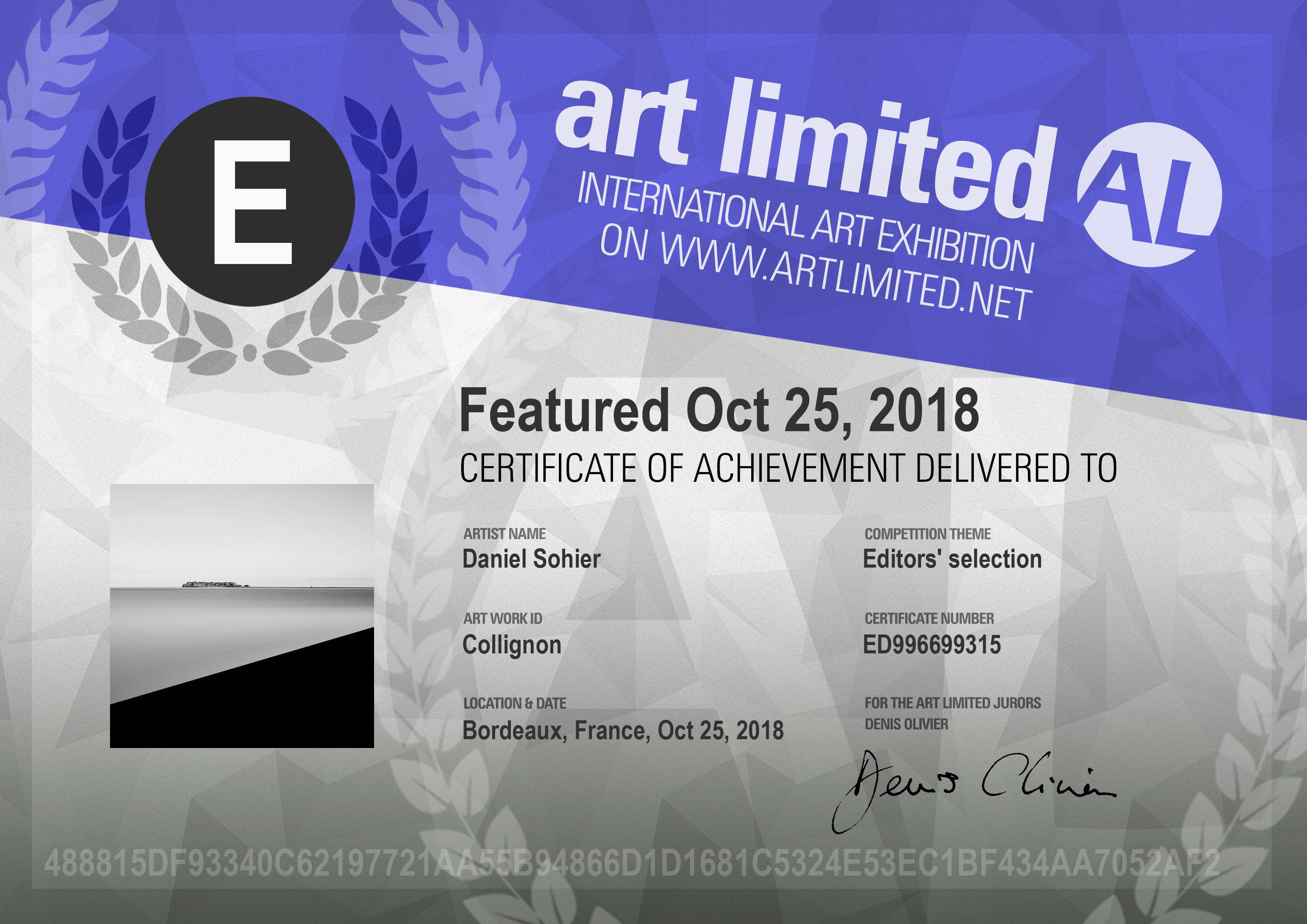 Sélectionné parmi les 50 lauréats au PRIX DU JURY NOIR ET BLANC ILFORD 1986. Thème : Atmosphère Botanique